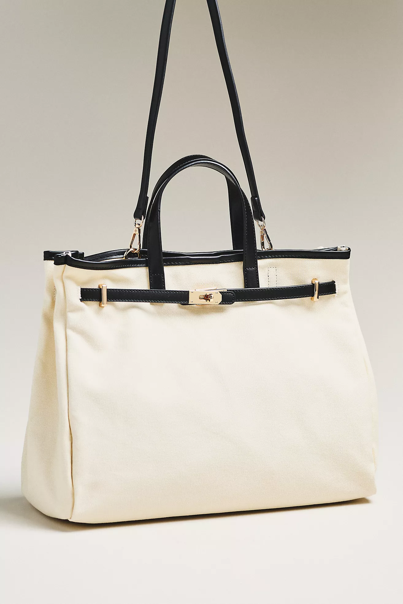 Faux-Leather Trim Belted Canvas Tote