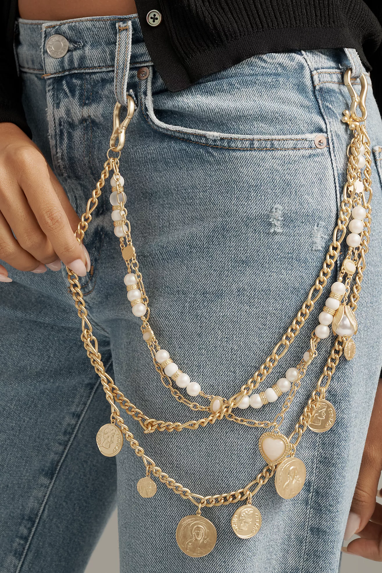 Layered Coin & Pearl Charm Pant Chain