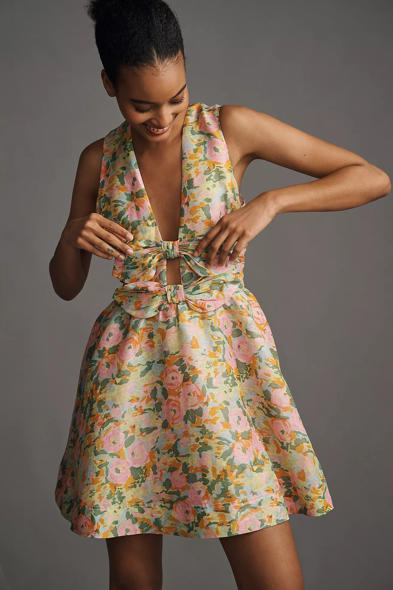 Lovaan Delilah Sleeveless Bow Linen-Silk Mini Dress
