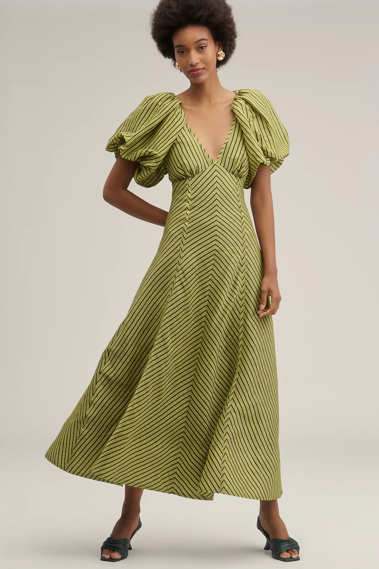 Lovaan Tess Linen Silk Puff-Sleeve Dress