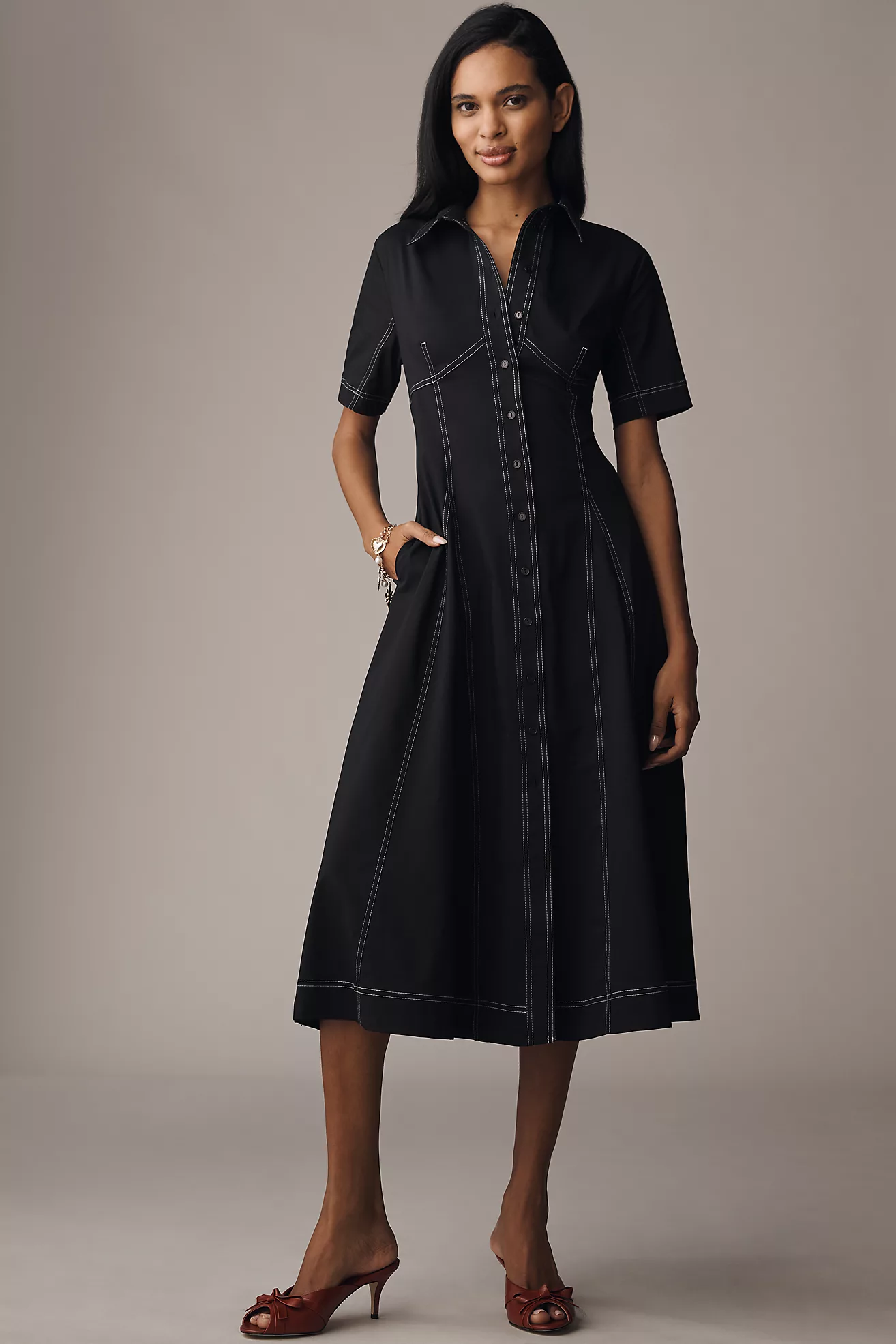 Exquise Short-Sleeve Seamed Pleated Midi Dress