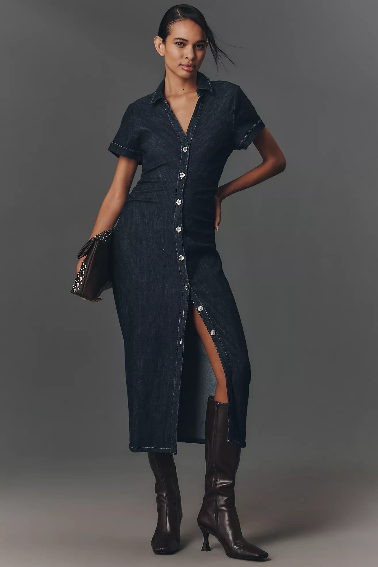 Pilcro Short-Sleeve Ruched Denim Midi Shirt Dress