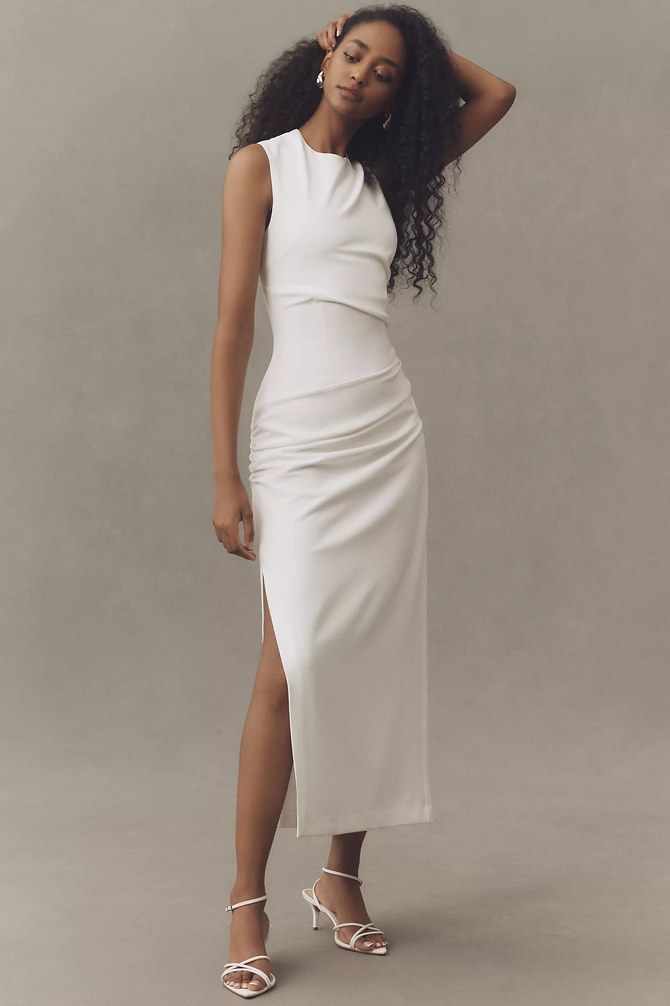 BHLDN Off-Shoulder Gathered Stretch Mesh Slim Midi Dress