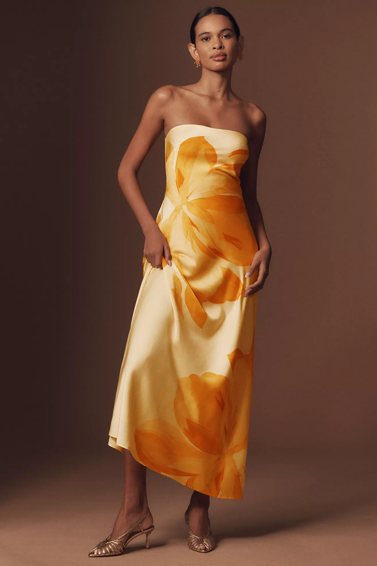 Hutch Costella Strapless Pleated Floral Tulle Midi Dress