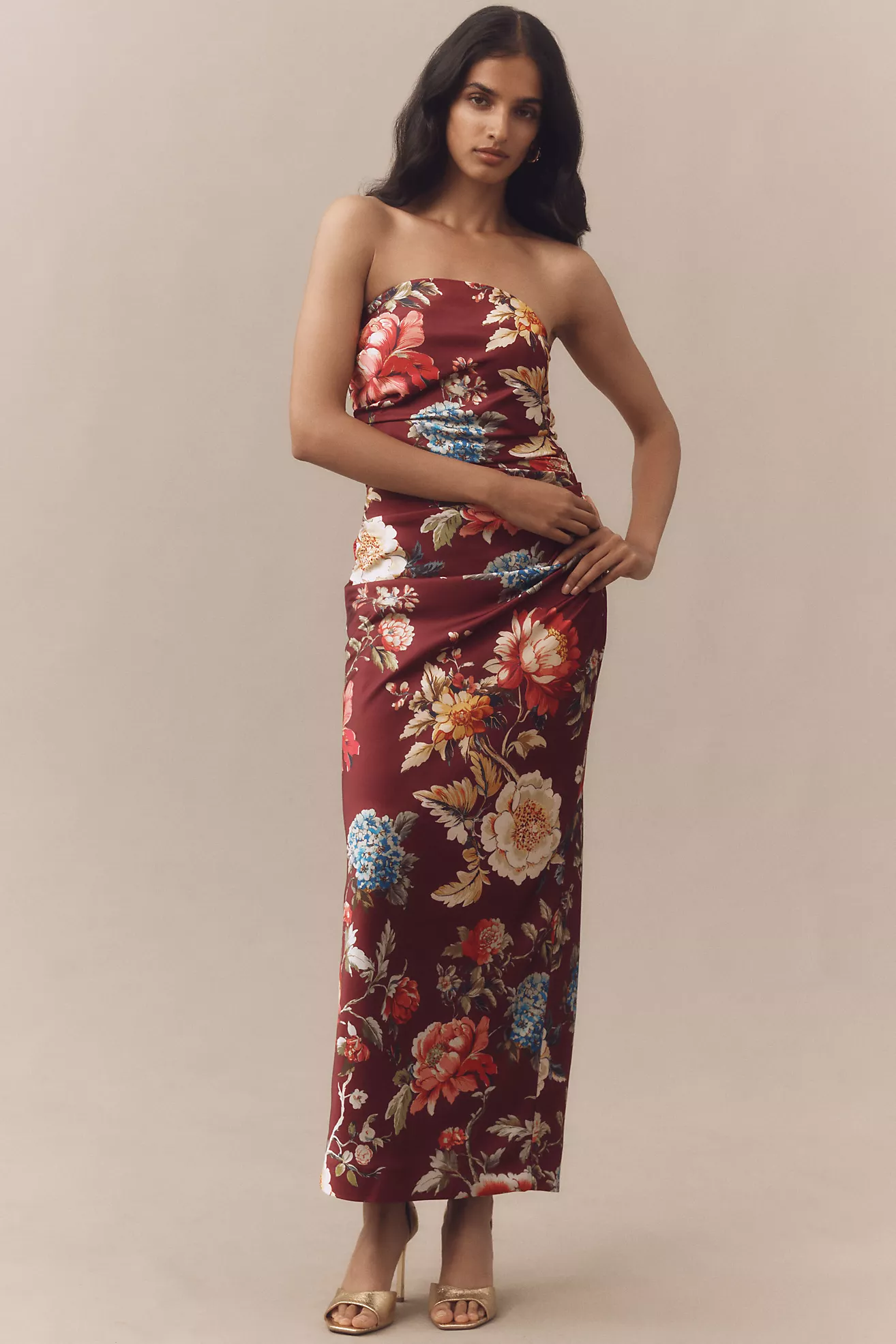 BHLDN Strapless Ruched Floral Stretch Satin Midi Dress