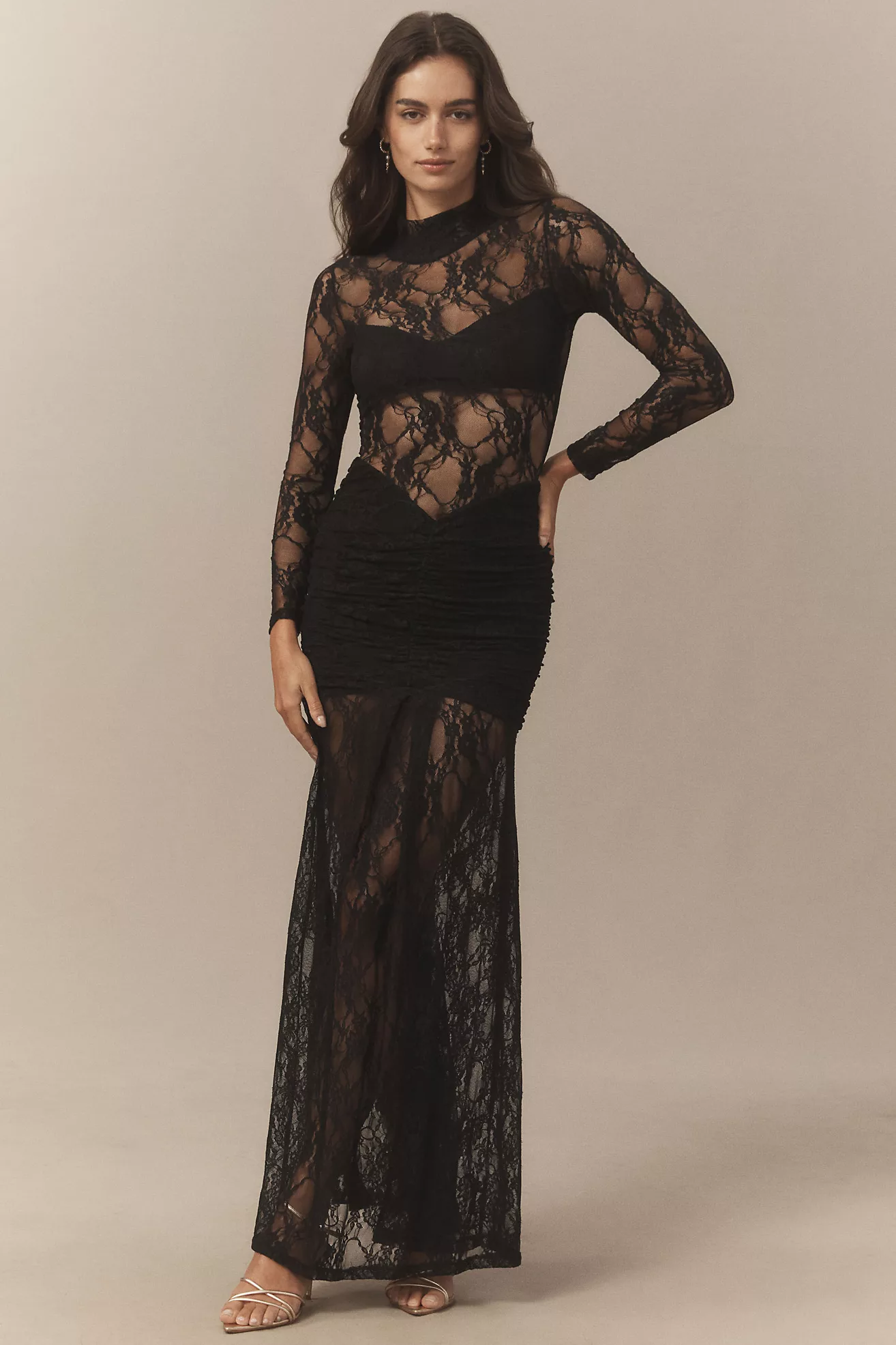 Nightcap Mock-Neck Drop-Waist Lace Maxi Dress