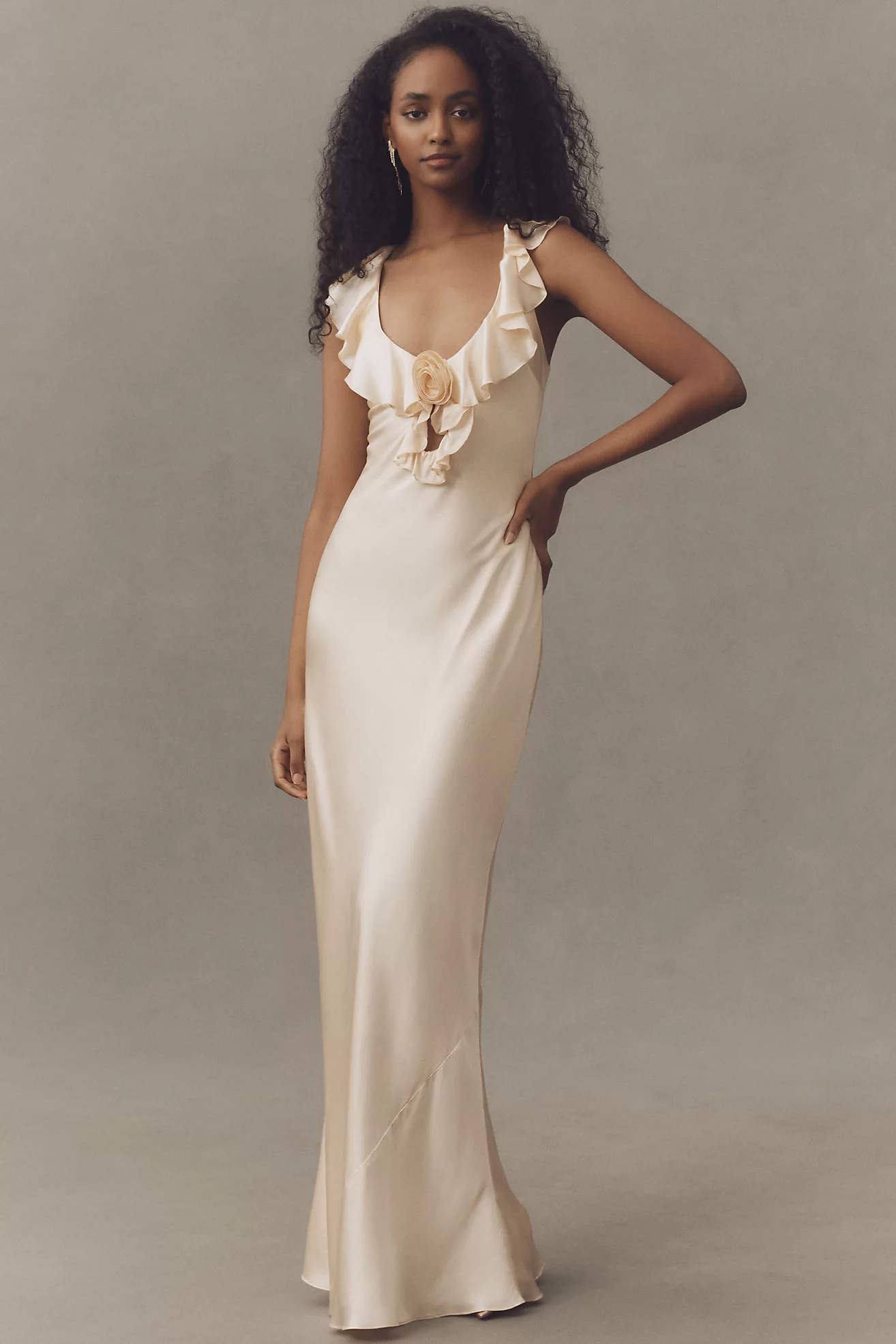 De La Vali Nema Ruffle Rosette Silk Satin Maxi Dress