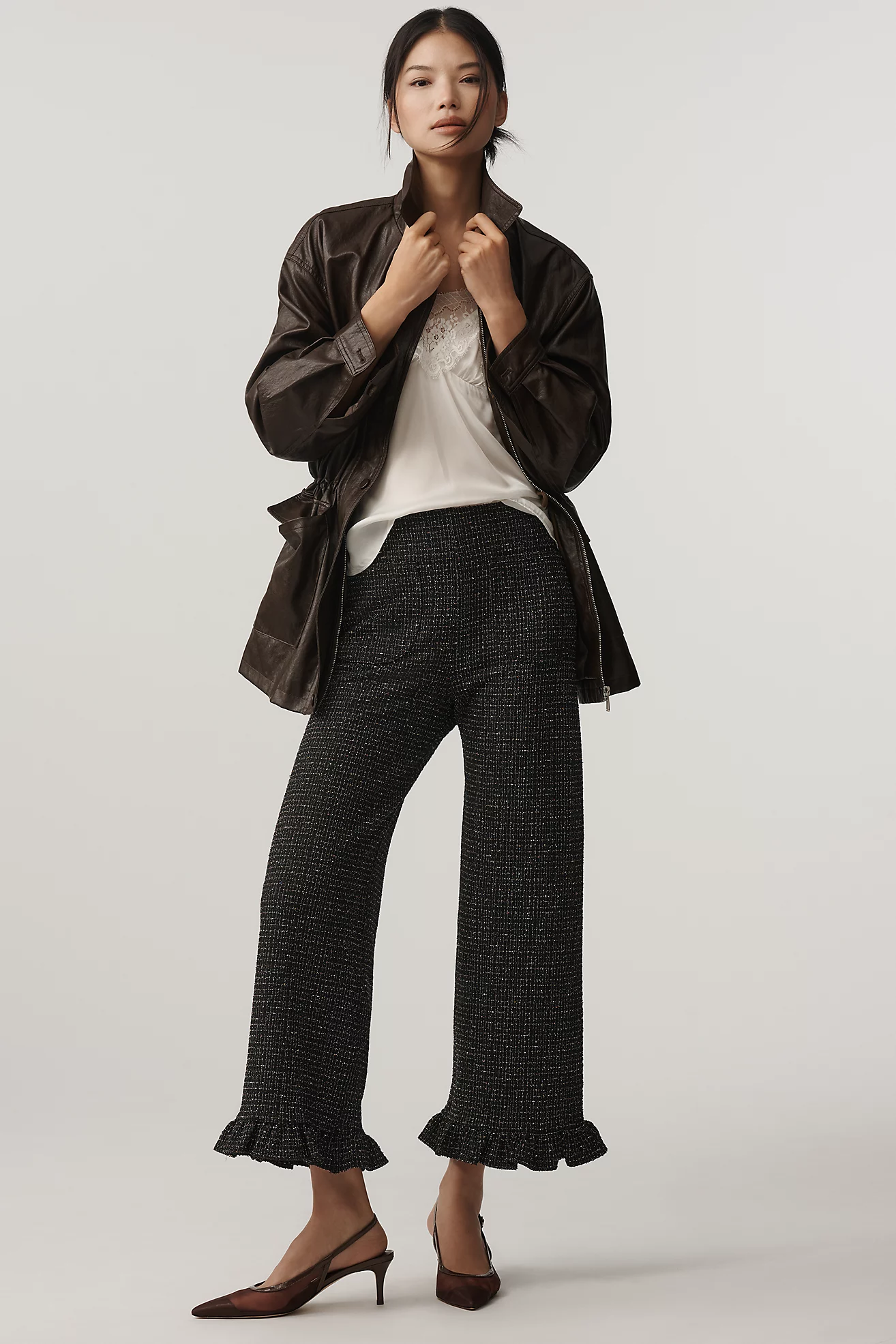 The Colette Crop Tweed Ruffle-Hem Pants by Maeve