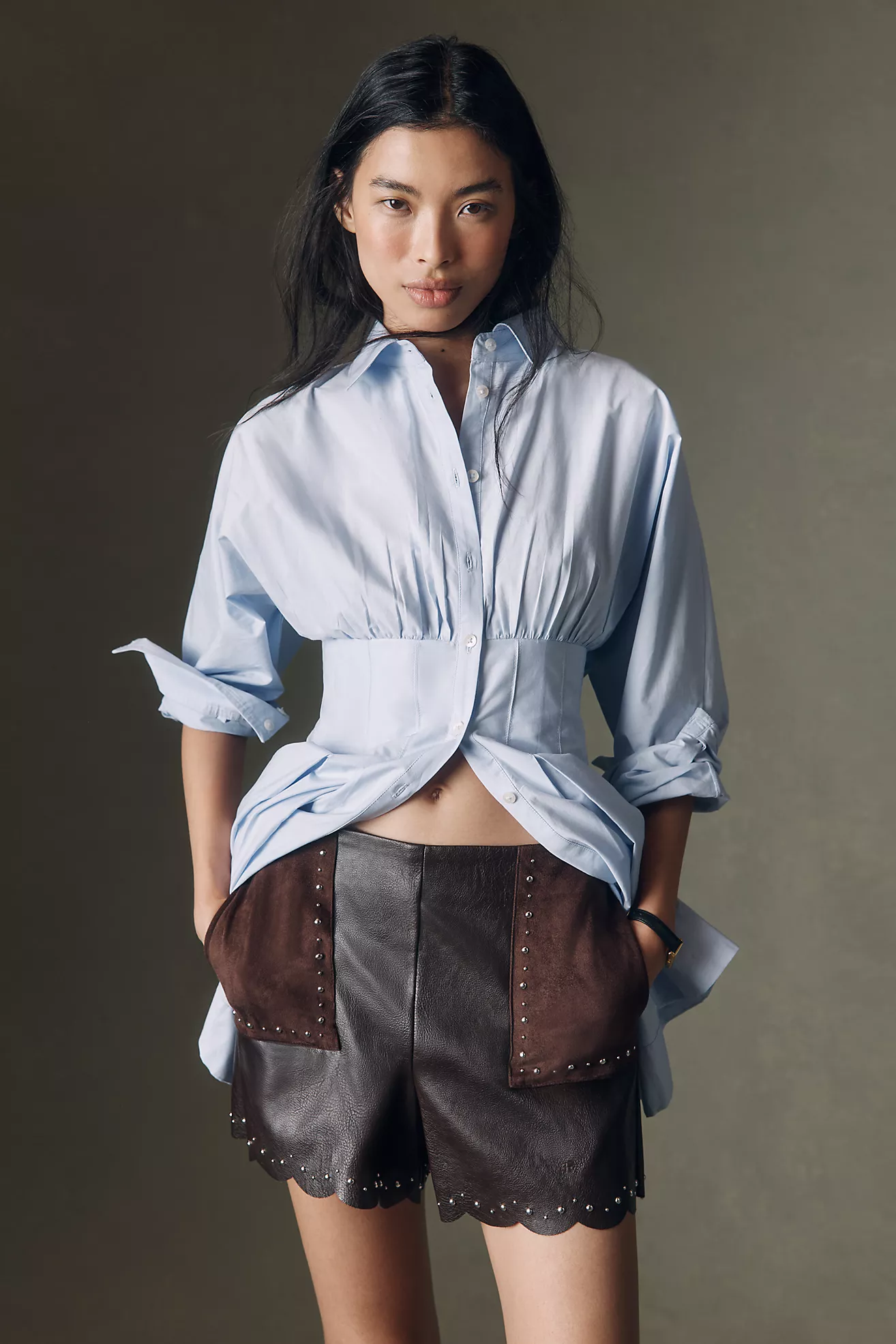 By Anthropologie Short-Sleeve Collared Linen Romper