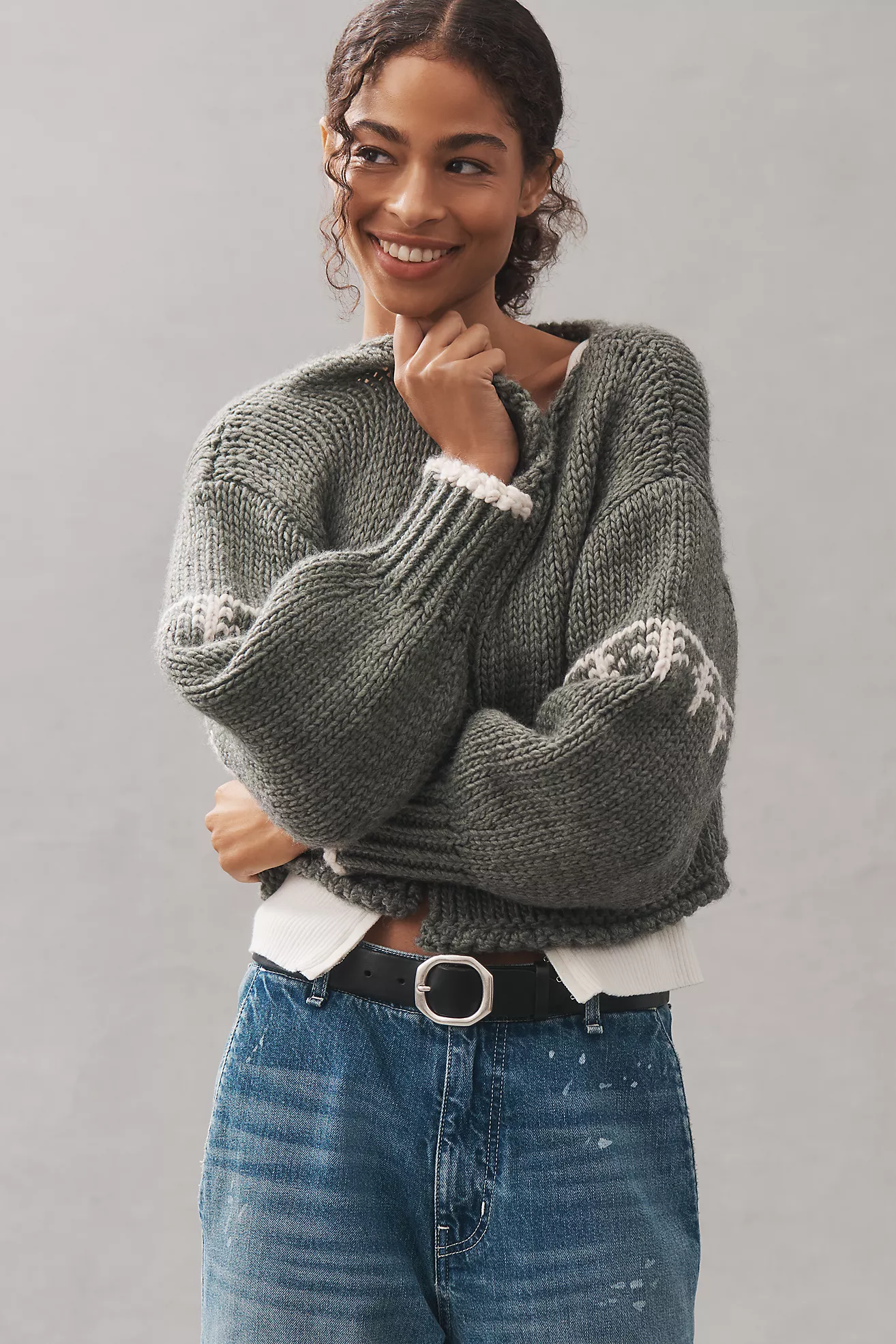 Farm Rio Winter Tapestry Stripes Puff-Sleeve Sweater