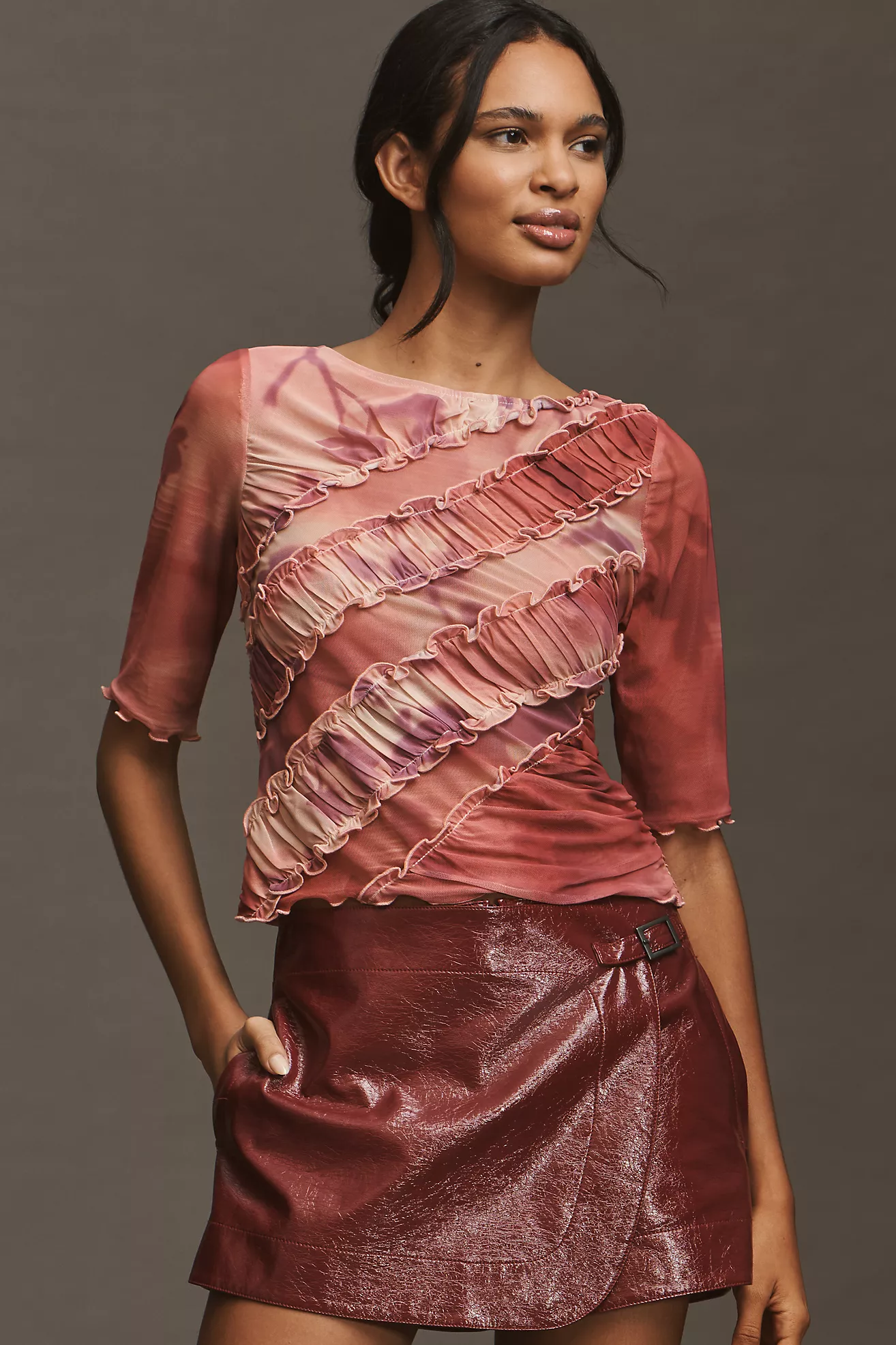 By Anthropologie Half-Sleeve Sheer Ruched Top