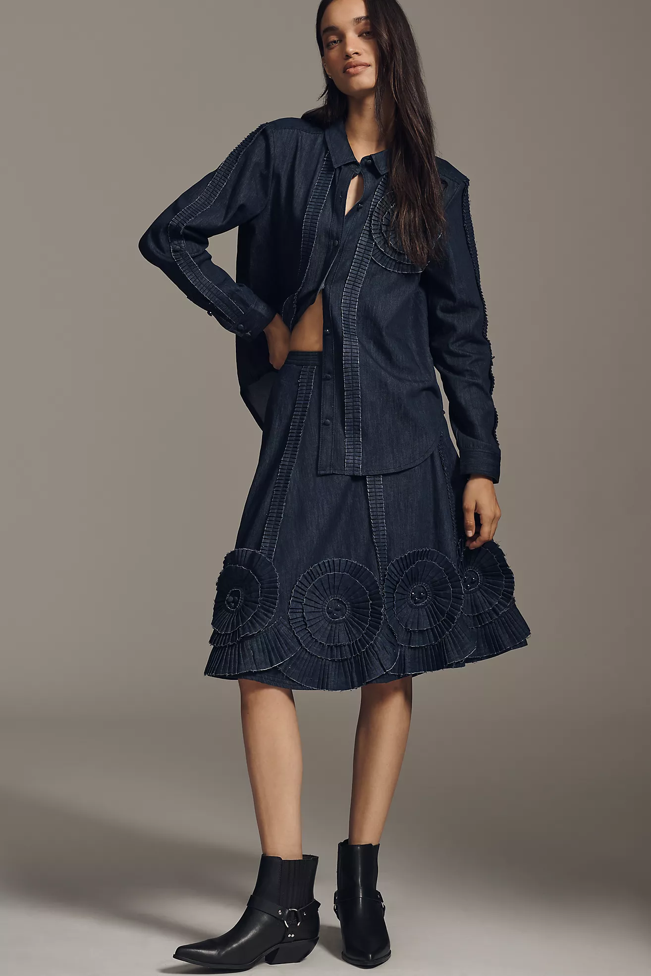 Pilcro Pleated Appliqué Denim Midi Skirt