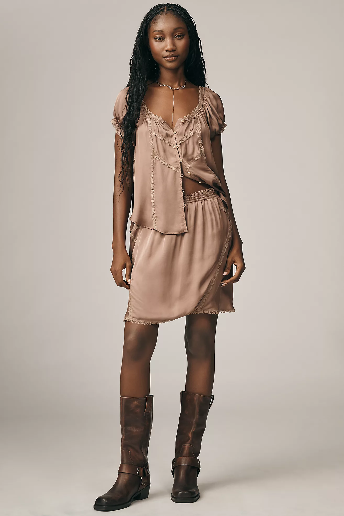 By Anthropologie Silky Lace-Trim Mini Skirt