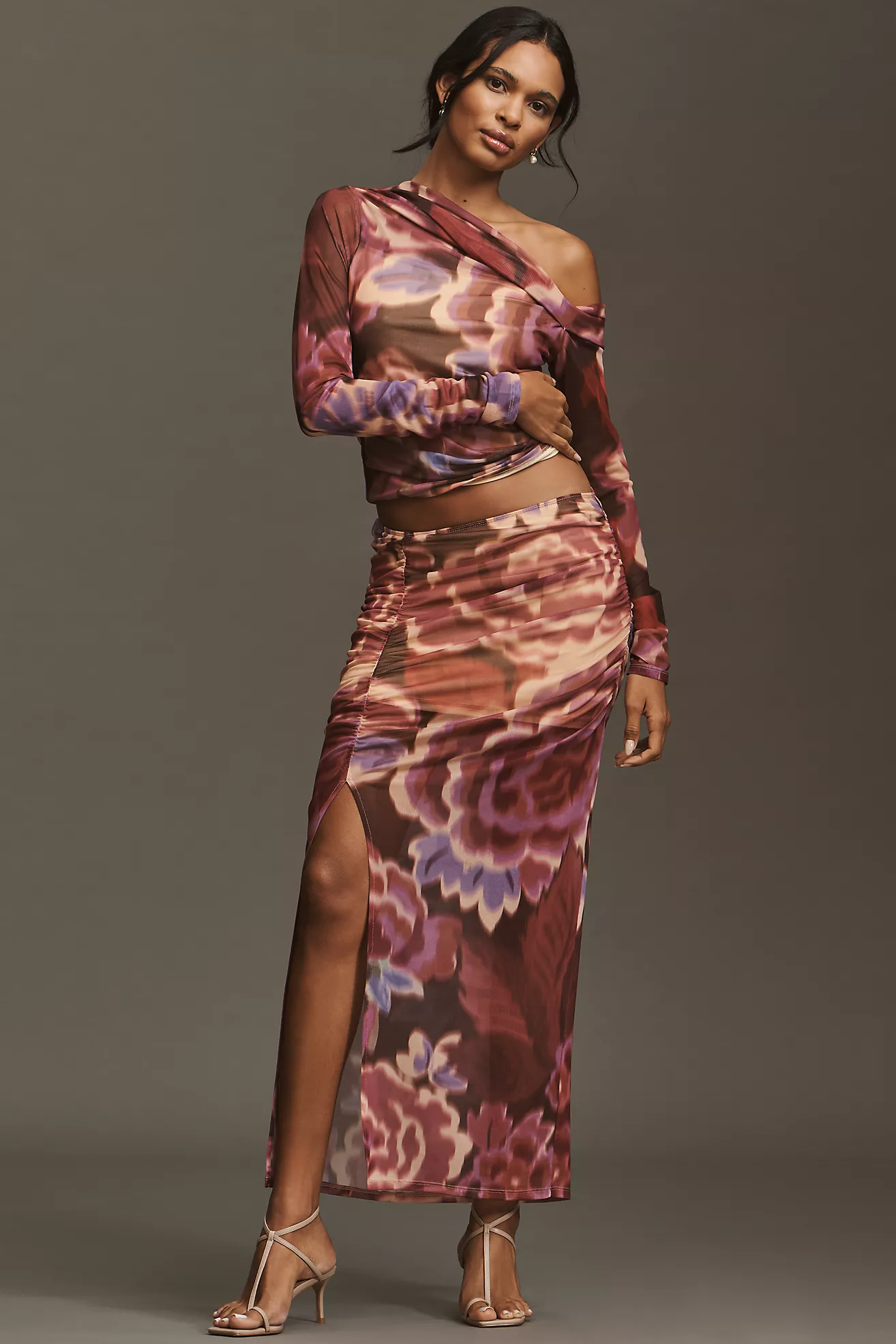 Maeve Fitted Ruched Mesh Maxi Skirt